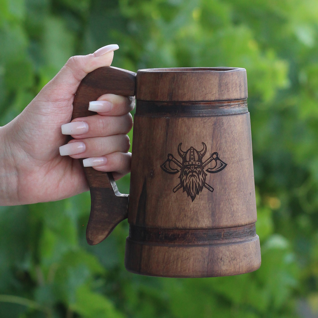 ماگ وایکینگ چوبی ساخته‌شده از چوب طبیعی گردو با طراحی یک‌تکه و حکاکی مرد وایکینگ؛ تجربه‌ای اصیل، الهام‌گرفته از دوران وایکینگ‌ها برای نوشیدن دلستر و نوشیدنی‌های مورد علاقه‌تان